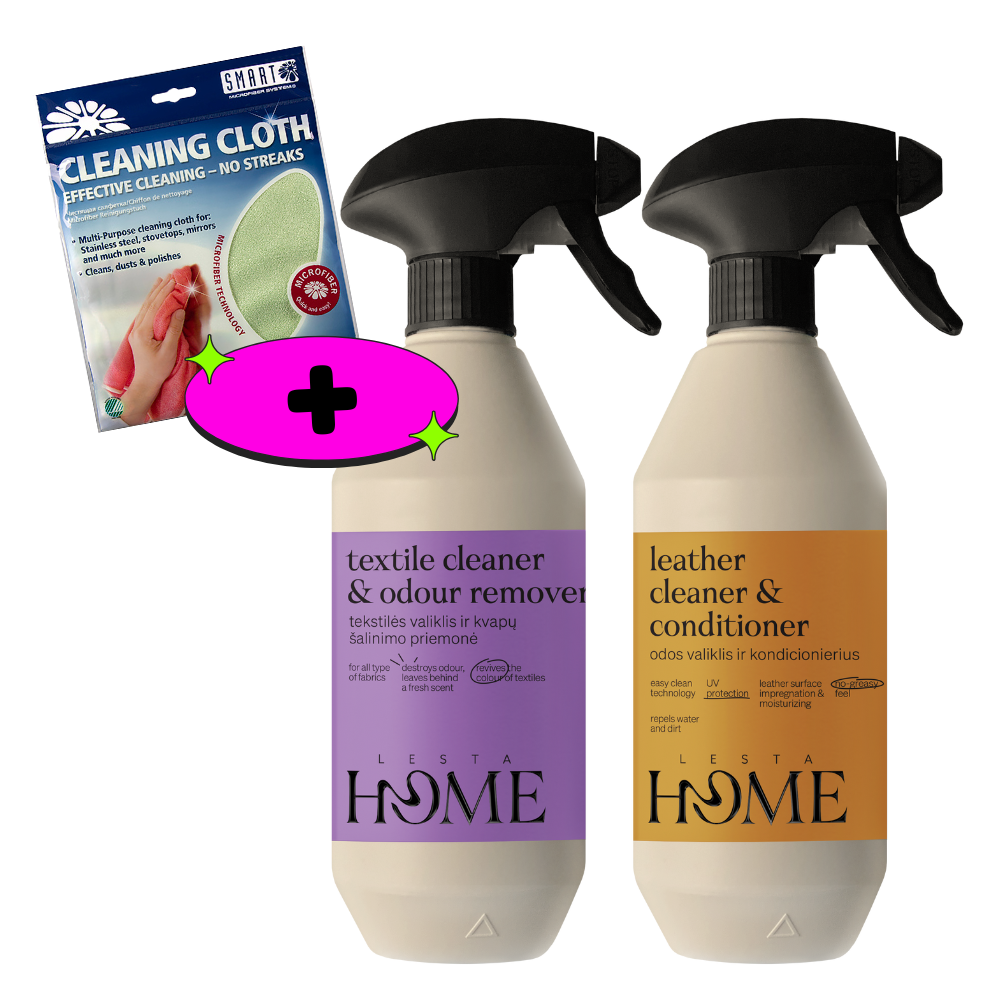 - „Lesta HOME“ audinių ir kvapų gelbėjimo rinkinys specialiai sukurtas audinių ir odos priežiūrai, užtikrinant, kad jūsų jautrūs paviršiai išliktų puikios būklės. Jis puikiai tinka apmušalų, automobilių salonų ir odinių baldų valymui.